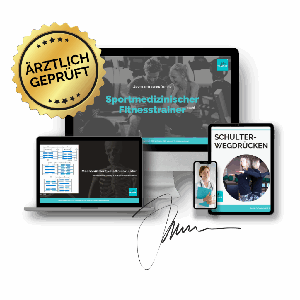 Als Premium-Produkt bieten wir die ärztlich geprüfte, sportmedizinische Fitnesstrainer-Lizenz an – ein Alleinstellungsmerkmal, das uns einzigartig im Markt macht. Diese Lizenz entspricht inhaltlich der A-Lizenz (McTrainer’s sportmedizinischer Fitnesstrainer), geht aber noch einen Schritt weiter: Die Abschlussprüfung wird von einem approbierten Arzt abgenommen. Damit erhält Dein Zertifikat den Zusatz „ärztlich geprüft“, was ein höchstes Maß an Glaubwürdigkeit und Qualität signalisiert.